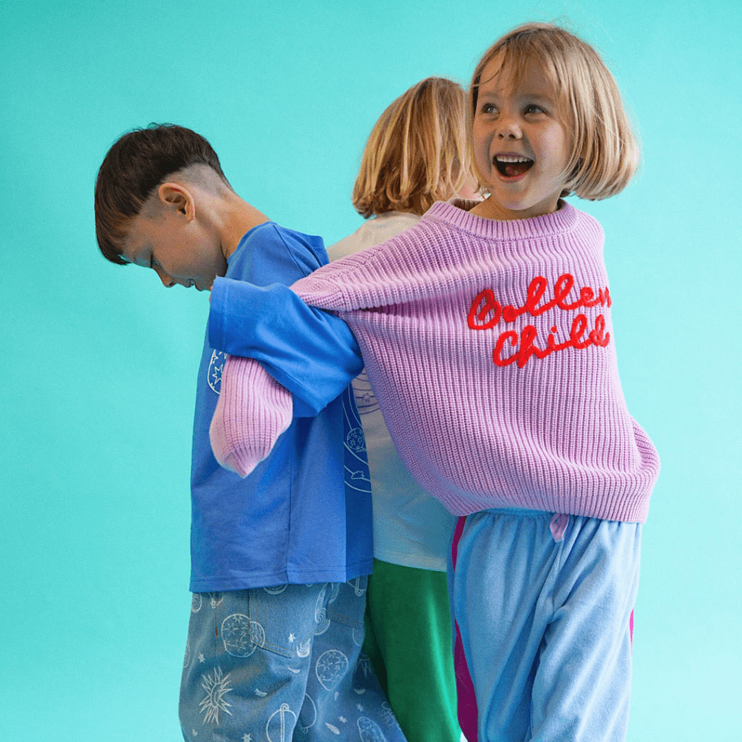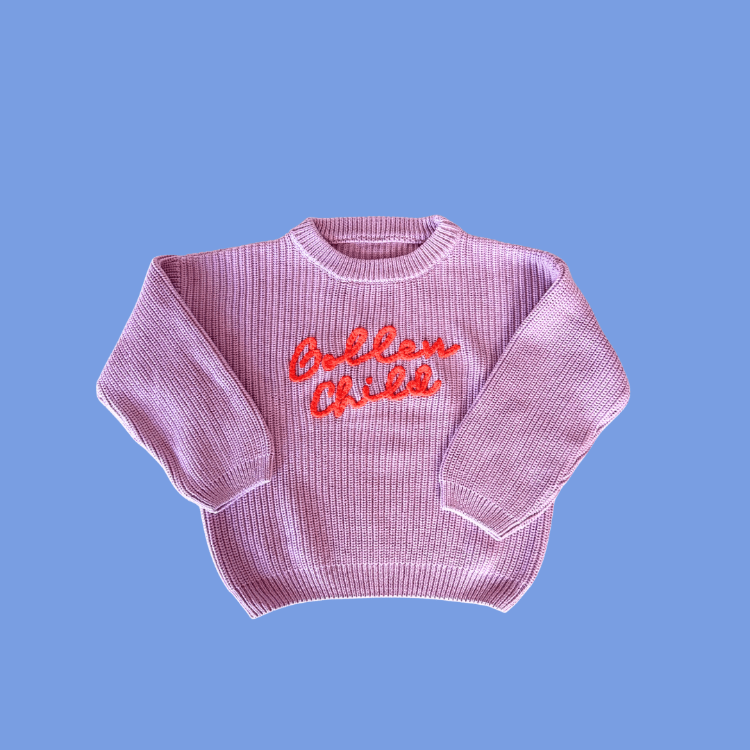 New colour alert and now available up to a size 8 (woohoo)! Add a pop of playful charm to your little one’s wardrobe with our Golden Child Retro Knit in lilac, featuring a beautifully hand-threaded logo in vibrant orange. This standout piece blends nostalgic design with everyday comfort, perfect for layering through every season.