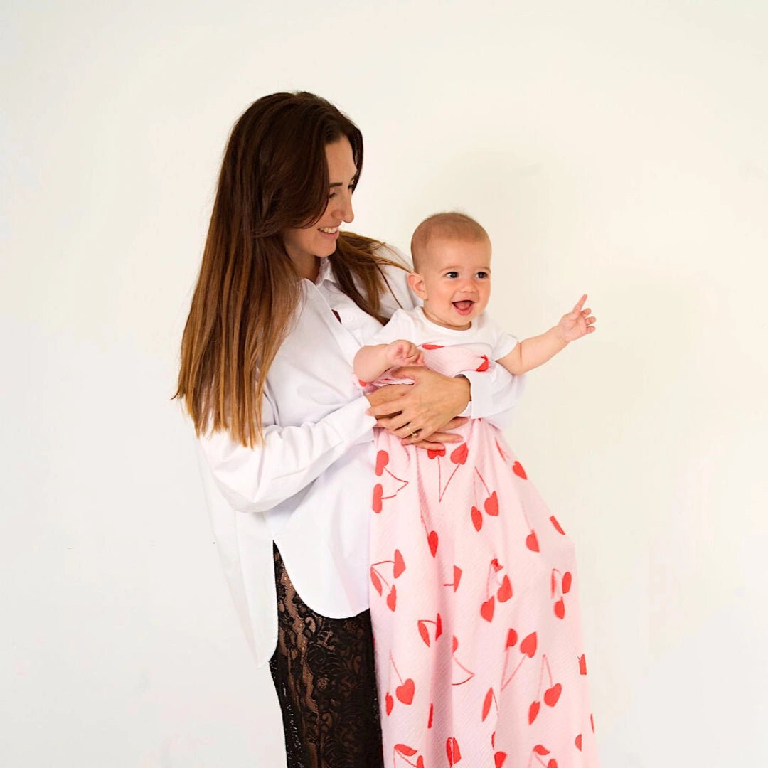 Wrap your little love in our Cherry Heart Baby Swaddle, a soft and breathable 100% GOTS-certified organic cotton muslin essential. With its cheerful pink-and-red heart print, this all-season swaddle is a must-have for every newborn, bringing a pop of joy to everyday moments.